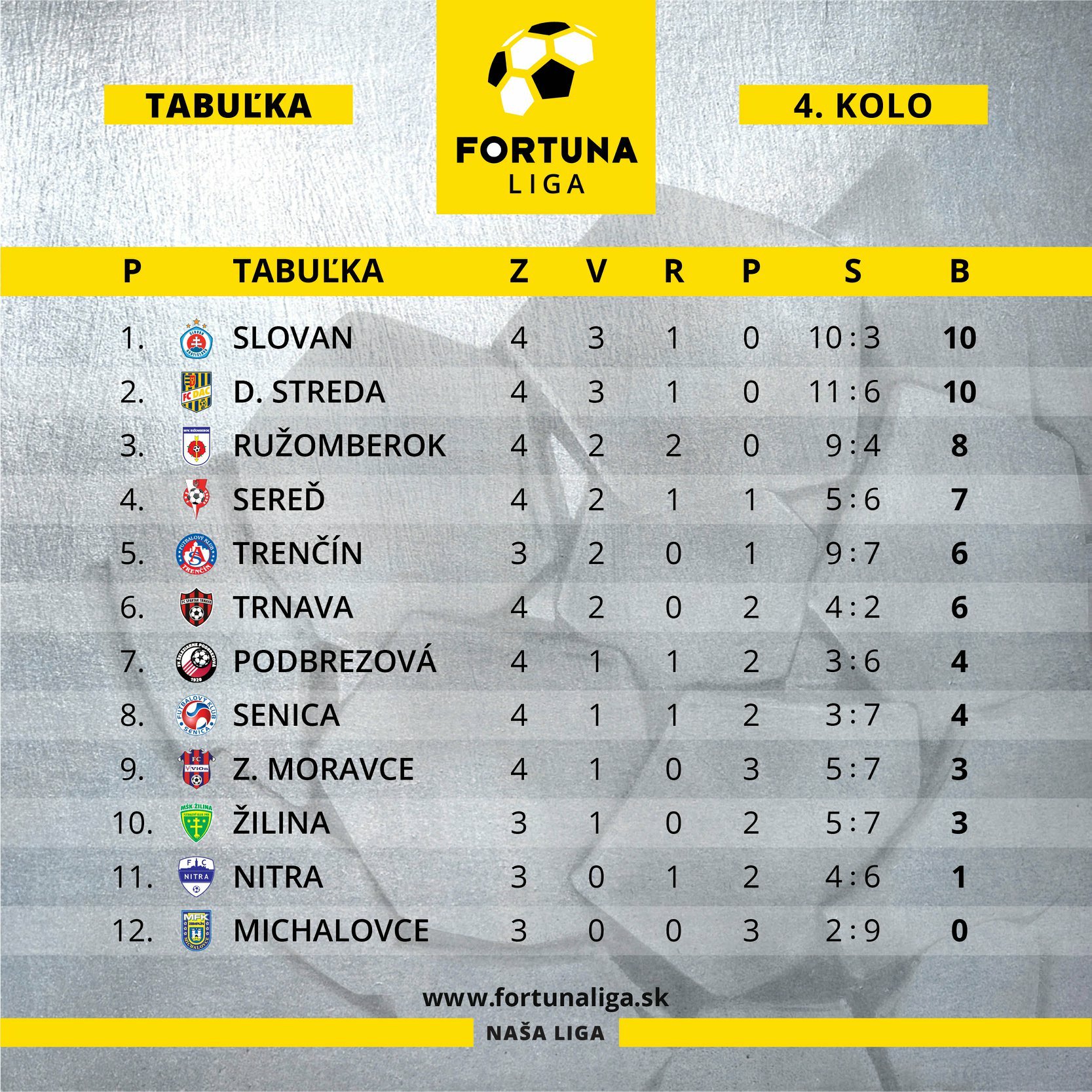 FC DAC 1904 - Újpest FC 21 FC DAC 1904 - Vasas SC 21 FC DAC 1904 - Szombathelyi Haladás 42. Der Tabellenführer der Fortuna Liga Tabelle ist derzeit SK Slovan Bratislava mit insgesamt 2 Punkten Vorsprung vor der zweitplazierten Mannschaft MSK Zilina. A szlovák élvonalbeli labdarúgó-bajnokság Fortuna Liga felsőházi rájátszásának 9.